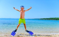 Strand: kavicsos, sziklás (kb. 100 m-re); napernyők és nyugágyak felár ellenében