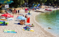 Strand: sziklás, kavicsos, köves (kb. 50 m-re), betonos napozórészekkel, napernyő és napágy kölcsönzés